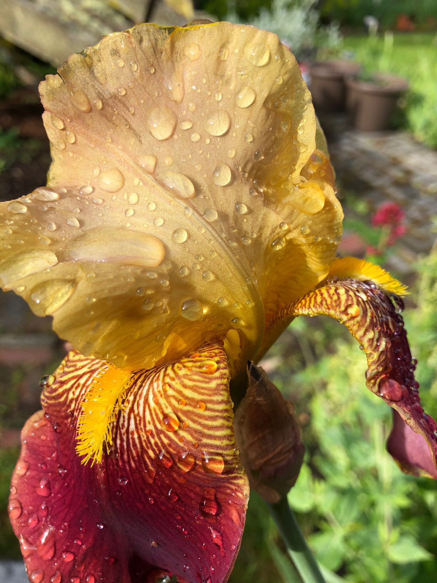 So I did, and time gave me an early morning bloom bursting forth from its tissue-paper cocoon to the wildness that is Iris, a thing to behold. Have you ever looked at an Iris up close? Those punk yellow mohawks, the trembling royal velvet skin, (for it feels moist, more like skin than petals), and that crown of top folds, cryptic with the next glory? Outside my window, my companion smiled and nodded in dulcet colors topped with shrieking bands of neon fur surrounded by tiger stripes.